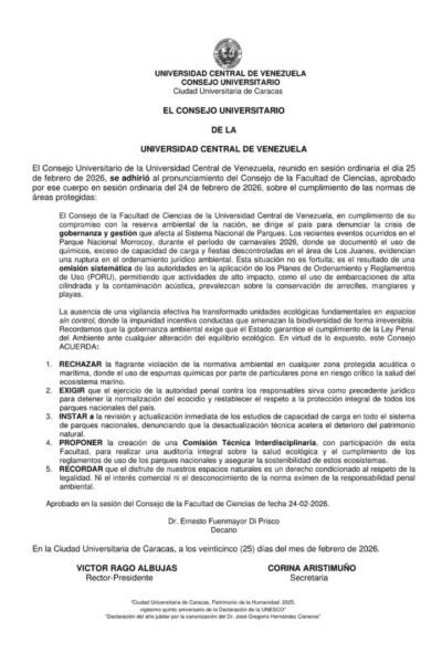 El Consejo Universitario de la Universidad Central de Venezuela (@cuucv_oficial) emitió un comunicado ante lo que califica como una grave «crisis de gobernanza y gestión» en el Sistema Nacional de Parques.