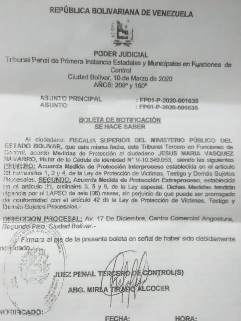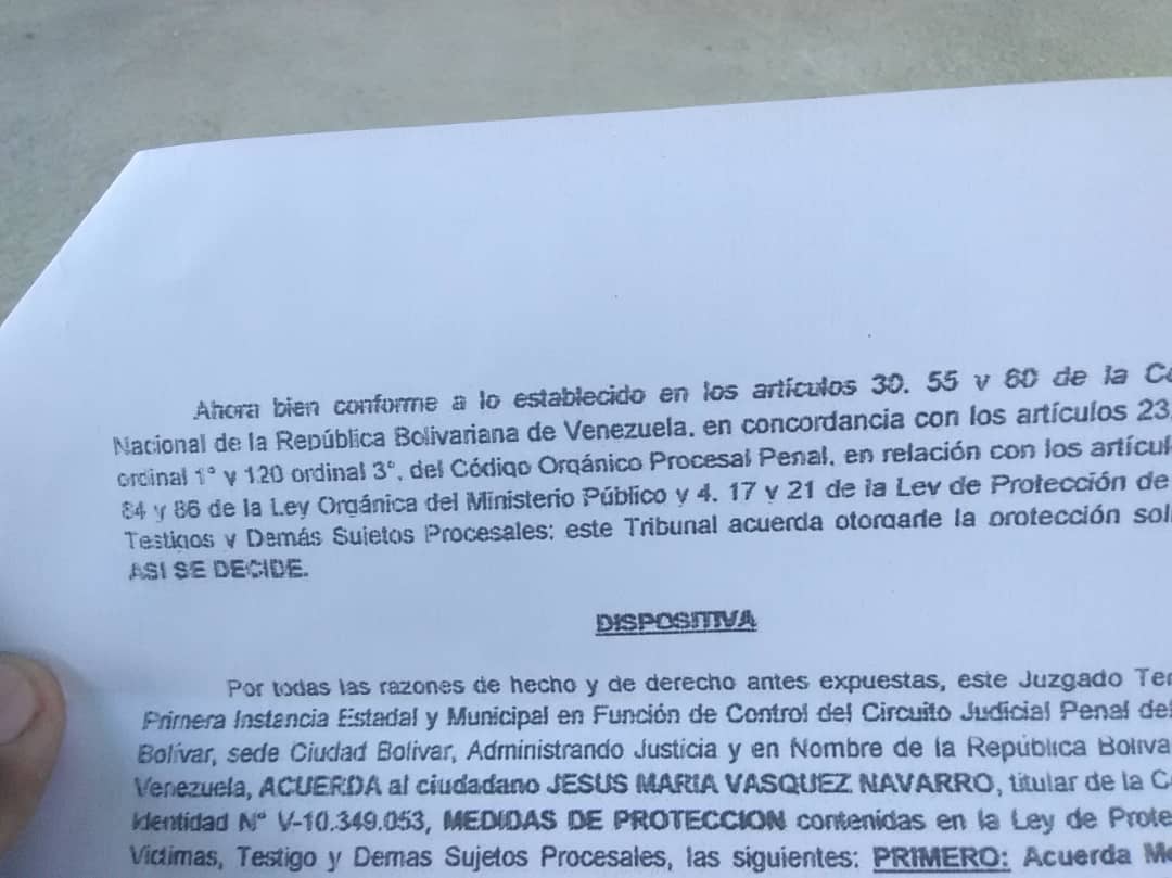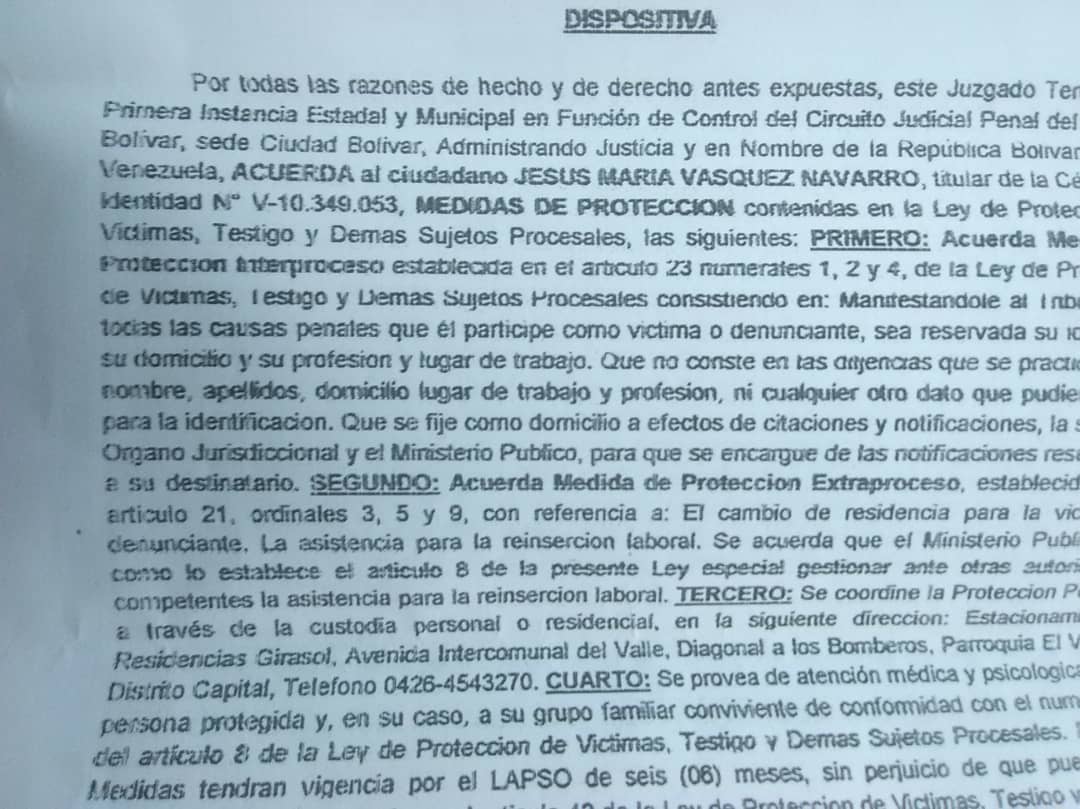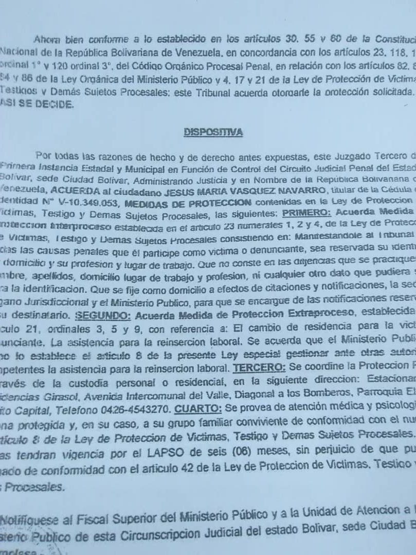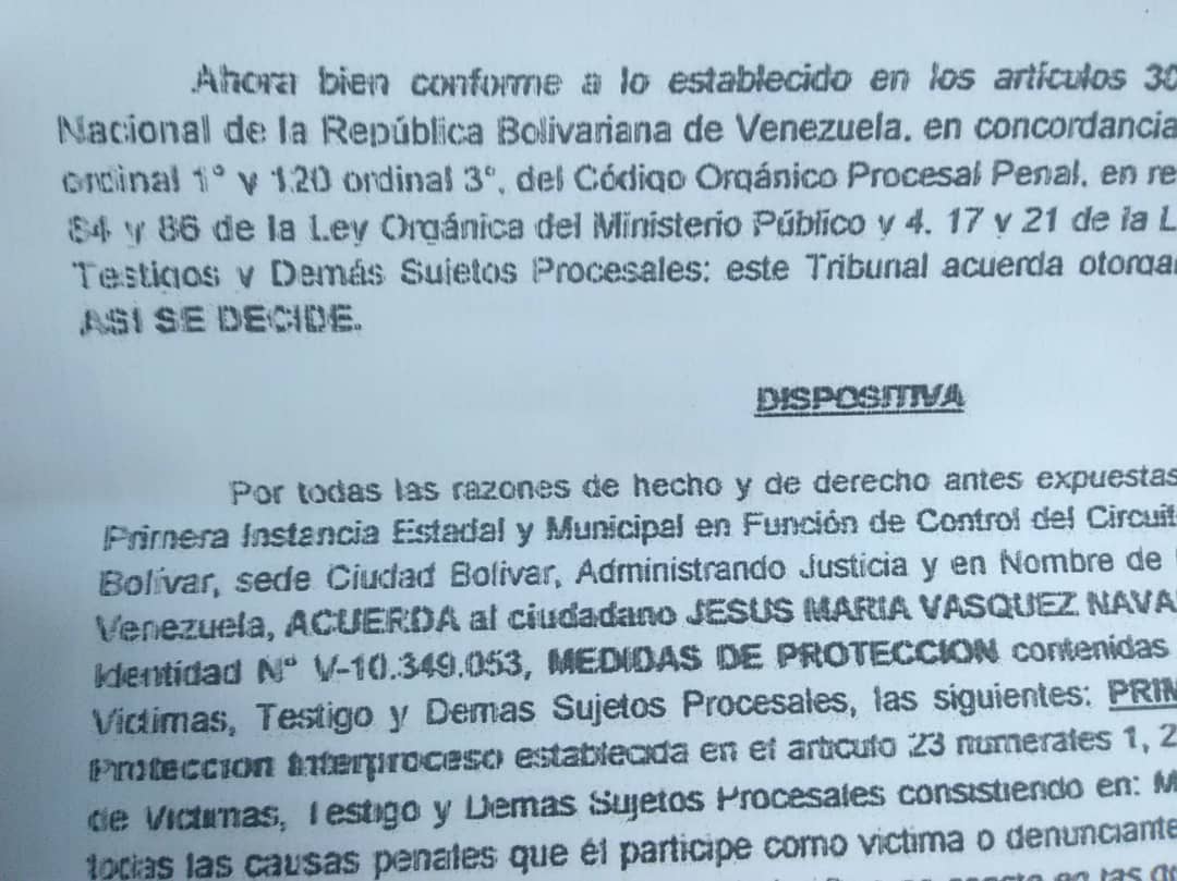 Vásquez interpuso su denuncia ante el Ministerio Público de Caracas bajo el expediente N° 301.581-2029, le asignaron dos fiscales, uno nacional y uno en el estado Bolívar. Con el apoyo de Provea, Jesús solicitó una medida de protección de un refugio ante la Comisión Nacional de Protección a las Víctimas del Ministerio Público (CONAPRO) la cual no pudo ser atendida por falta de presupuesto de la Fiscalía. Sin embargo, más adelante la Fiscalía solicitó a los Tribunales del estado Bolívar la medida de protección y fue decretado el “Cambio de Residencia y la Reinserción Laboral”, pero esta medida solo sirvió para que durmiera por unos días en un punto de vigilancia del presunto edifico donde iba a vivir. Esta situación empeoró, Jesús actualmente duerme -en un lugar que no se puede revelar por su seguridad- en un colchón en el piso, con personas de la calle, enfermos psiquiátricos y personas con tuberculosis, no recibe alimentación adecuada y teme por su integridad personal, no recibe atención médica, sin respeto por la dignidad humana y sin poder siquiera salir a buscar trabajo.